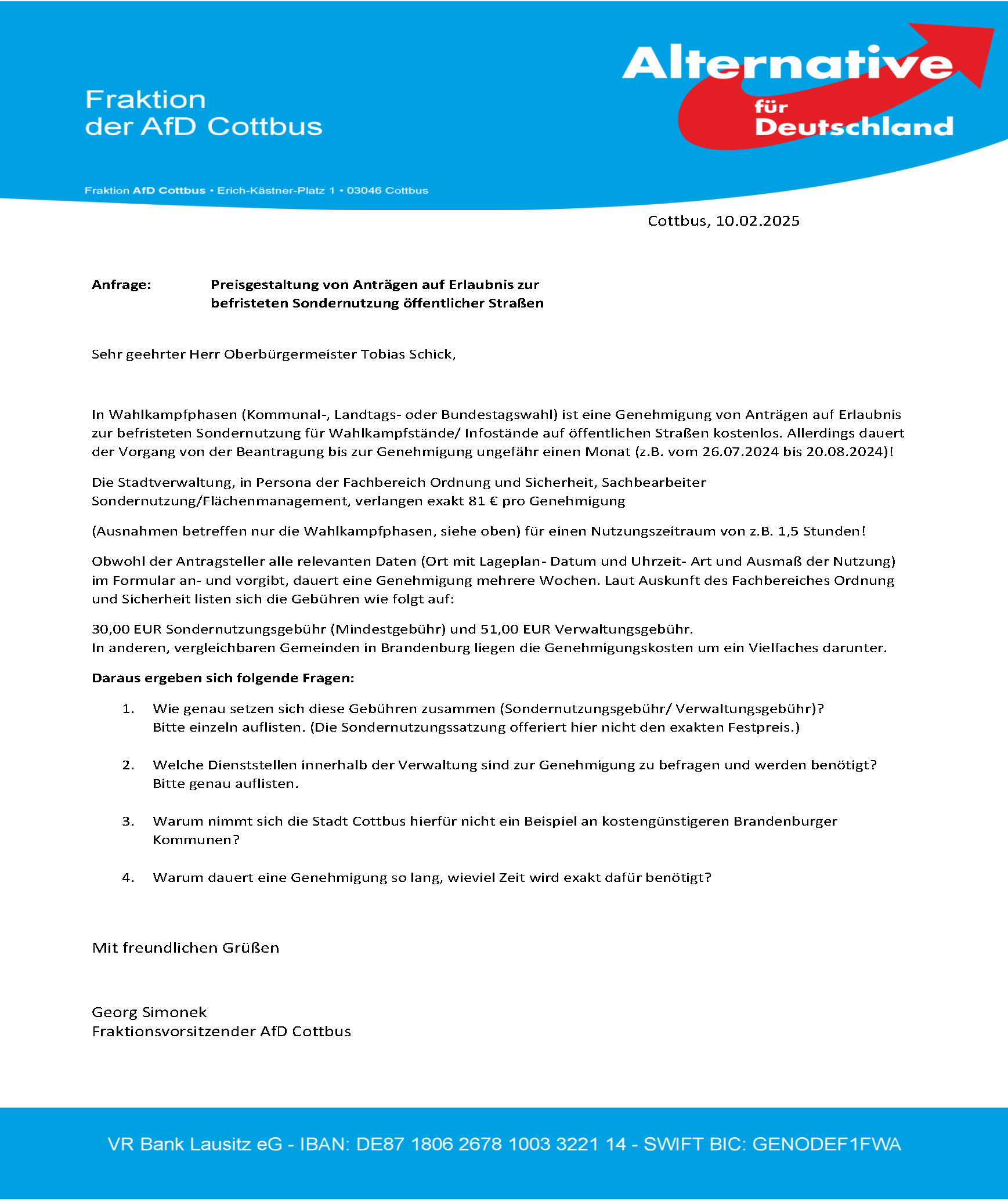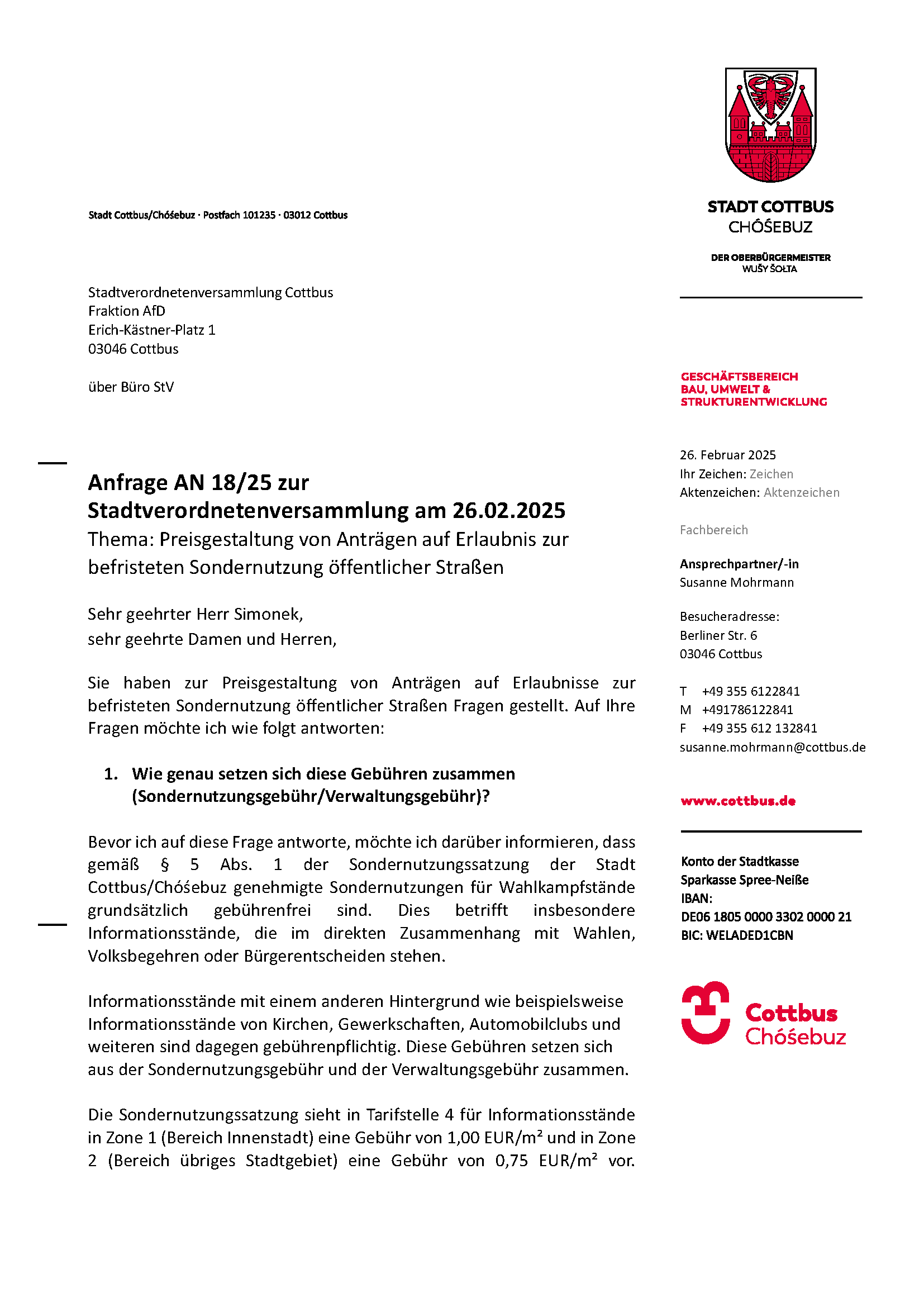Anfrage AN-18/25 – Preisgestaltung von Anträgen auf Erlaubnis zur befristeten Sondernutzung öffentlicher Straßen Download: AN_18_25 Download: Antwort_AN_18_25