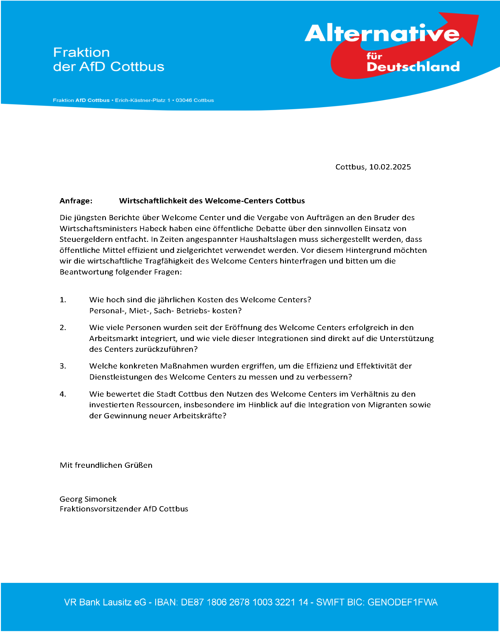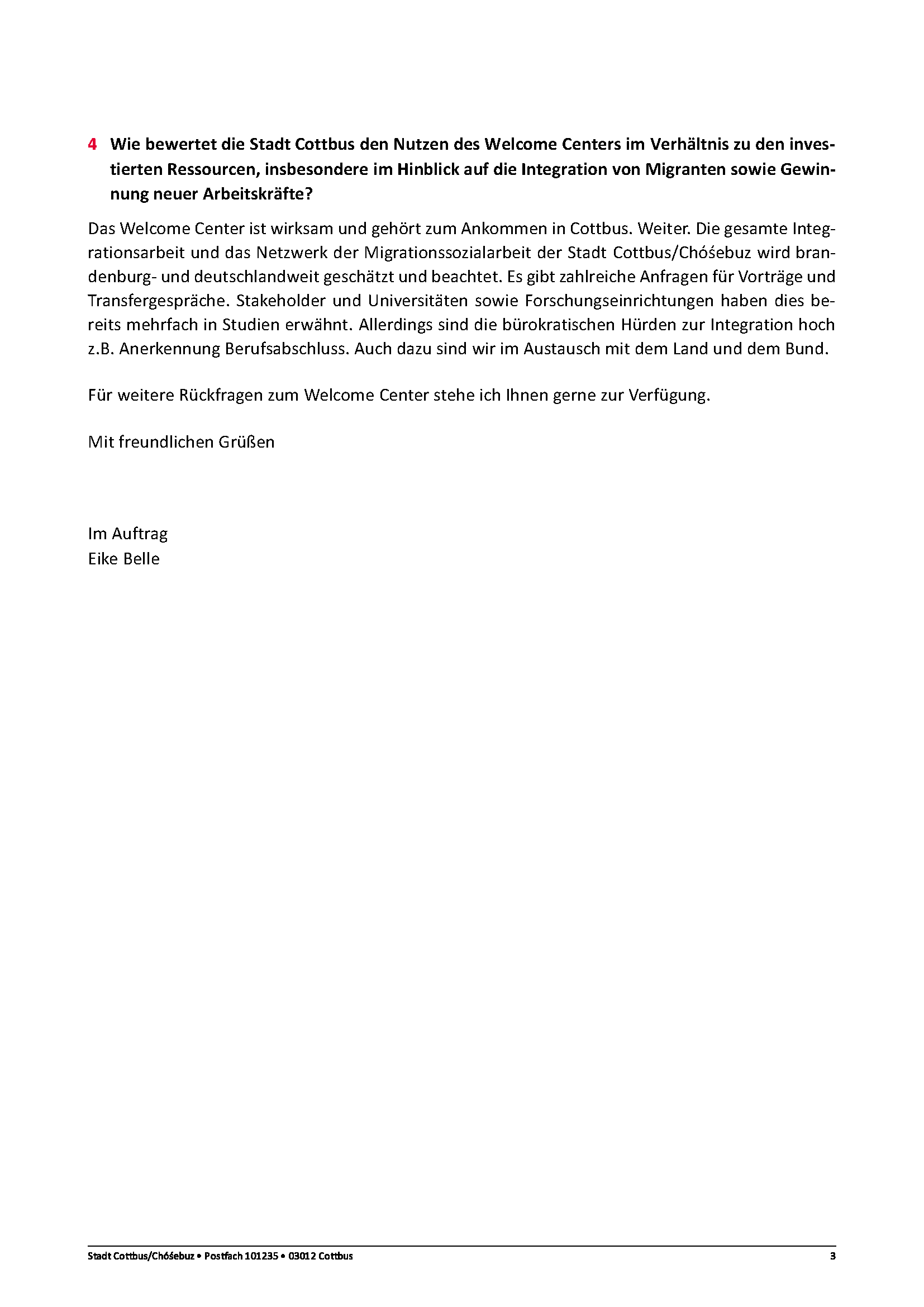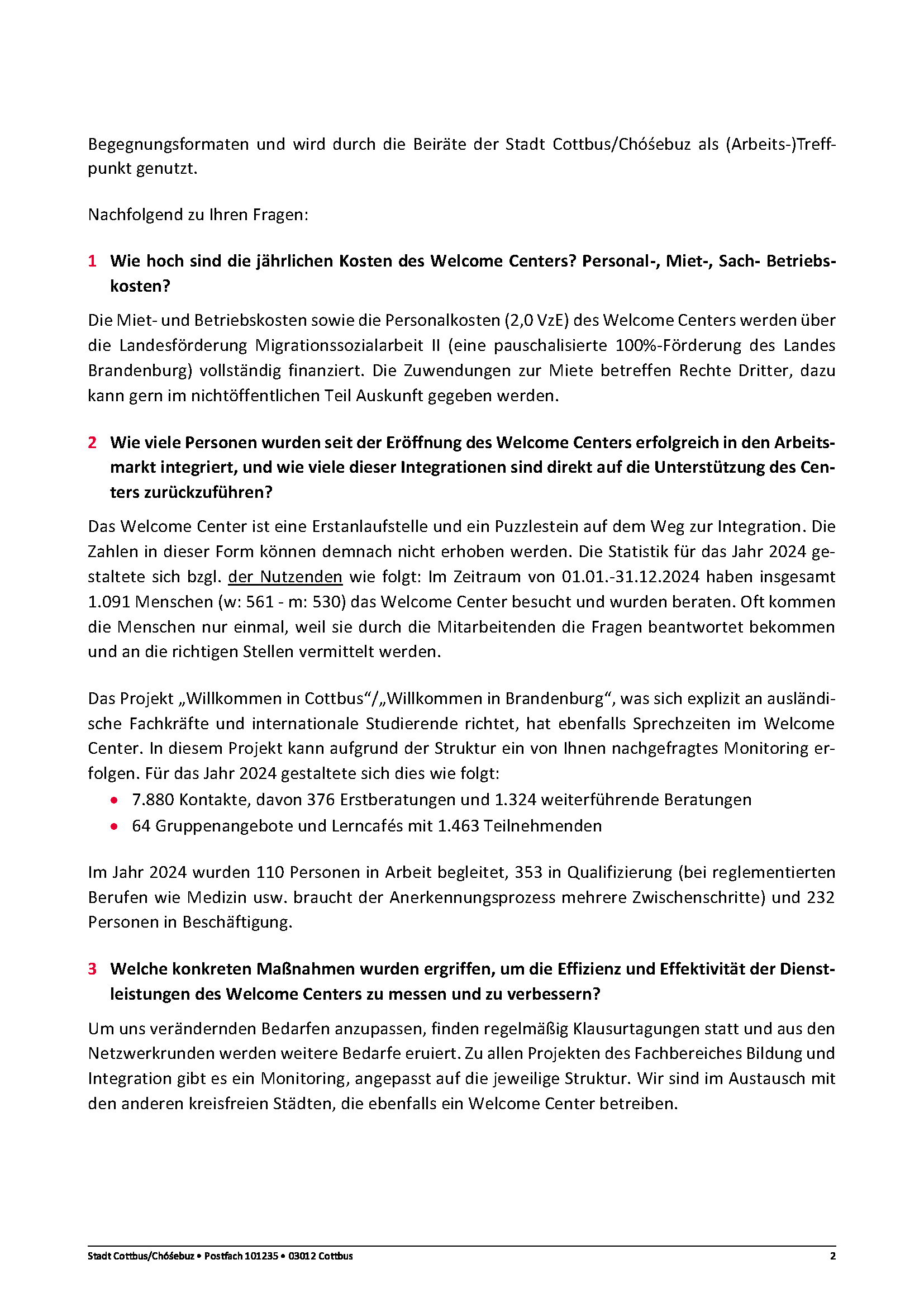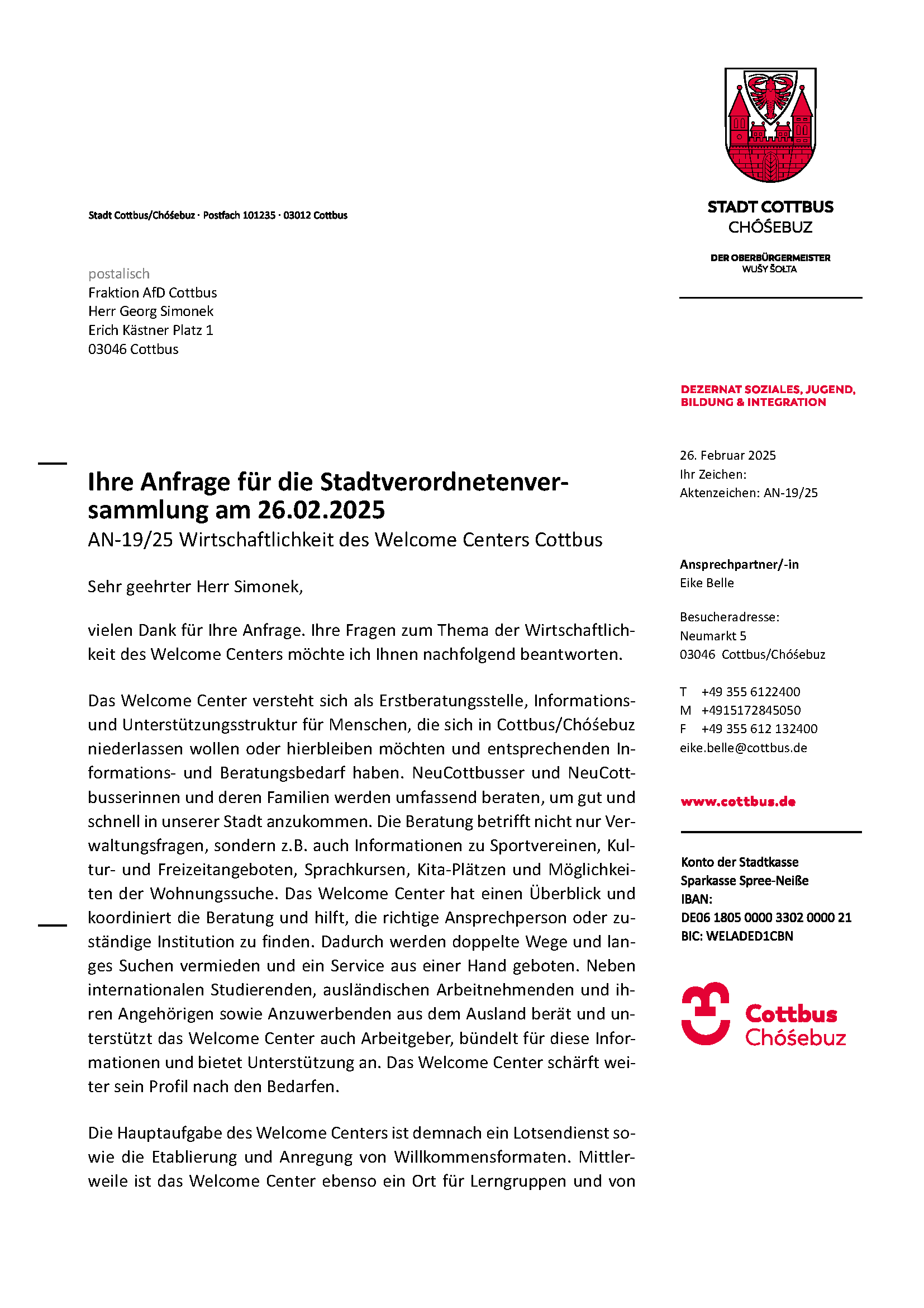 Anfrage AN-19/25 – Wirtschaftlichkeit des Welcome-Centers Cottbus