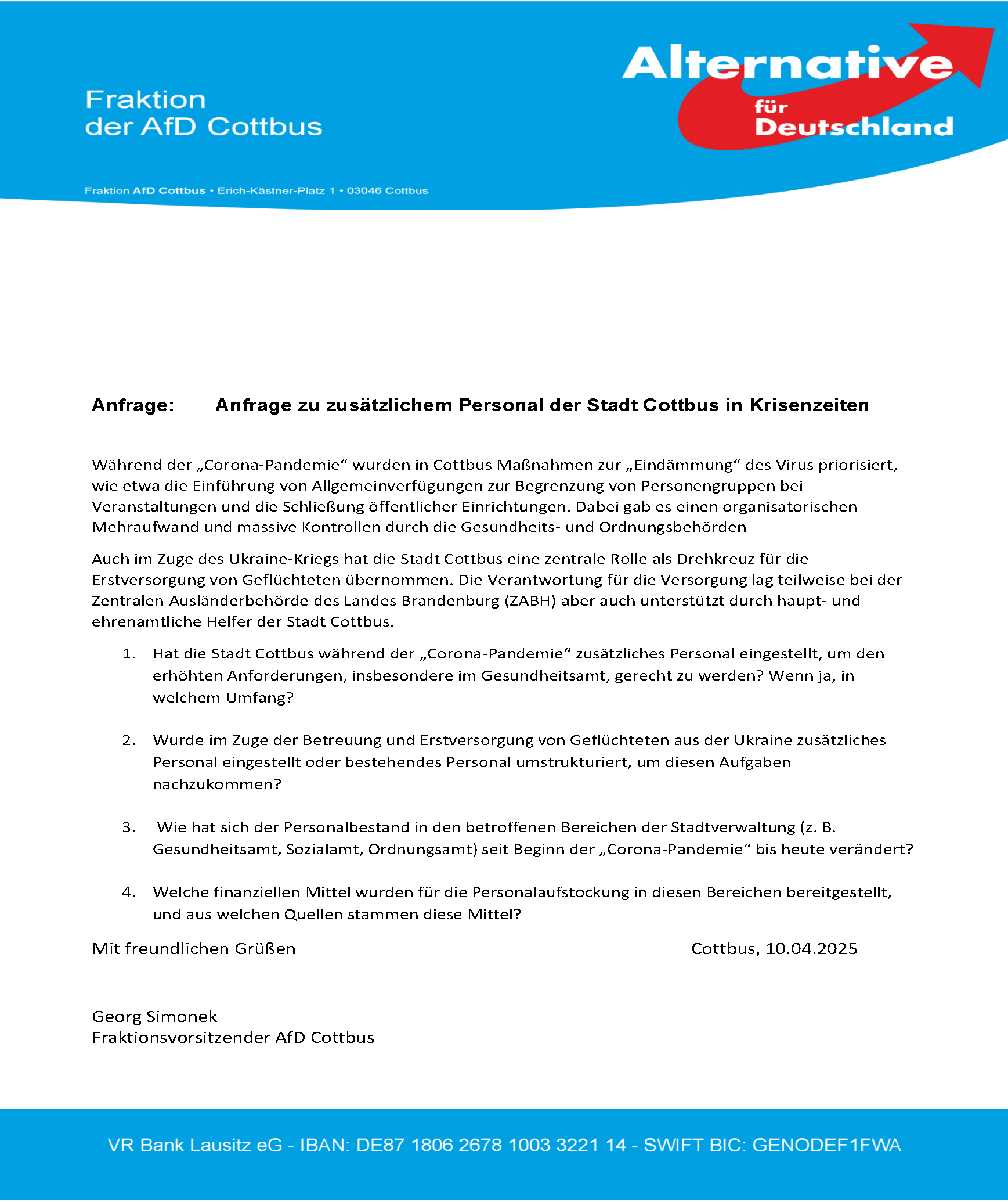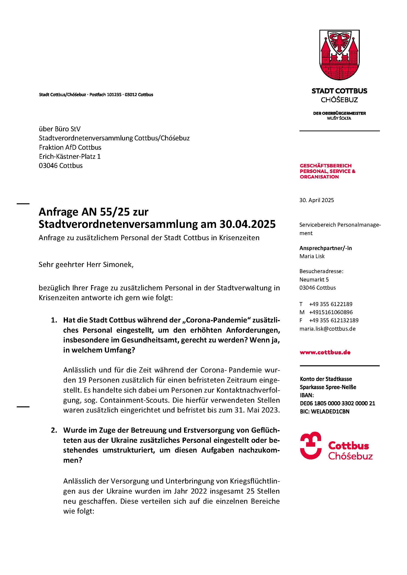 Anfrage AN-55/25 – Anfrage zu zusätzlichem Personal der Stadt Cottbus in Krisenzeiten Download: AN_55_25 Download: Antwort_AN_55_25