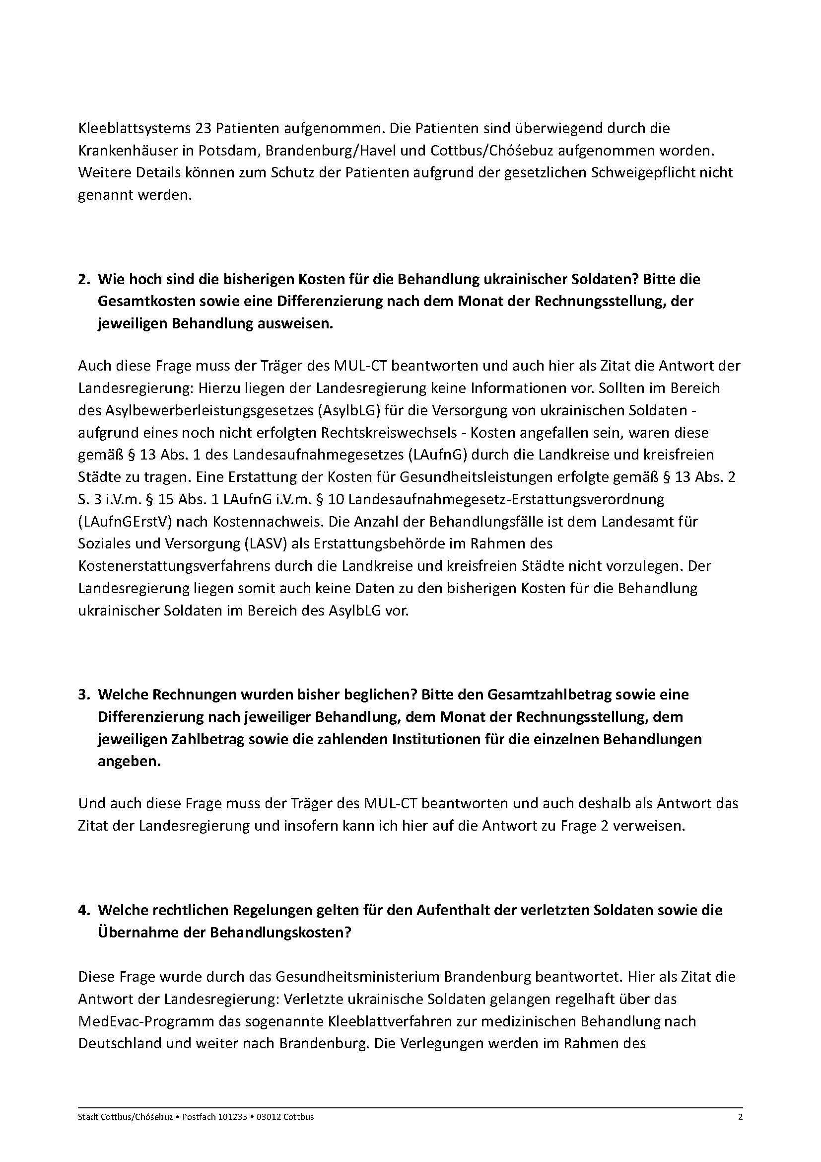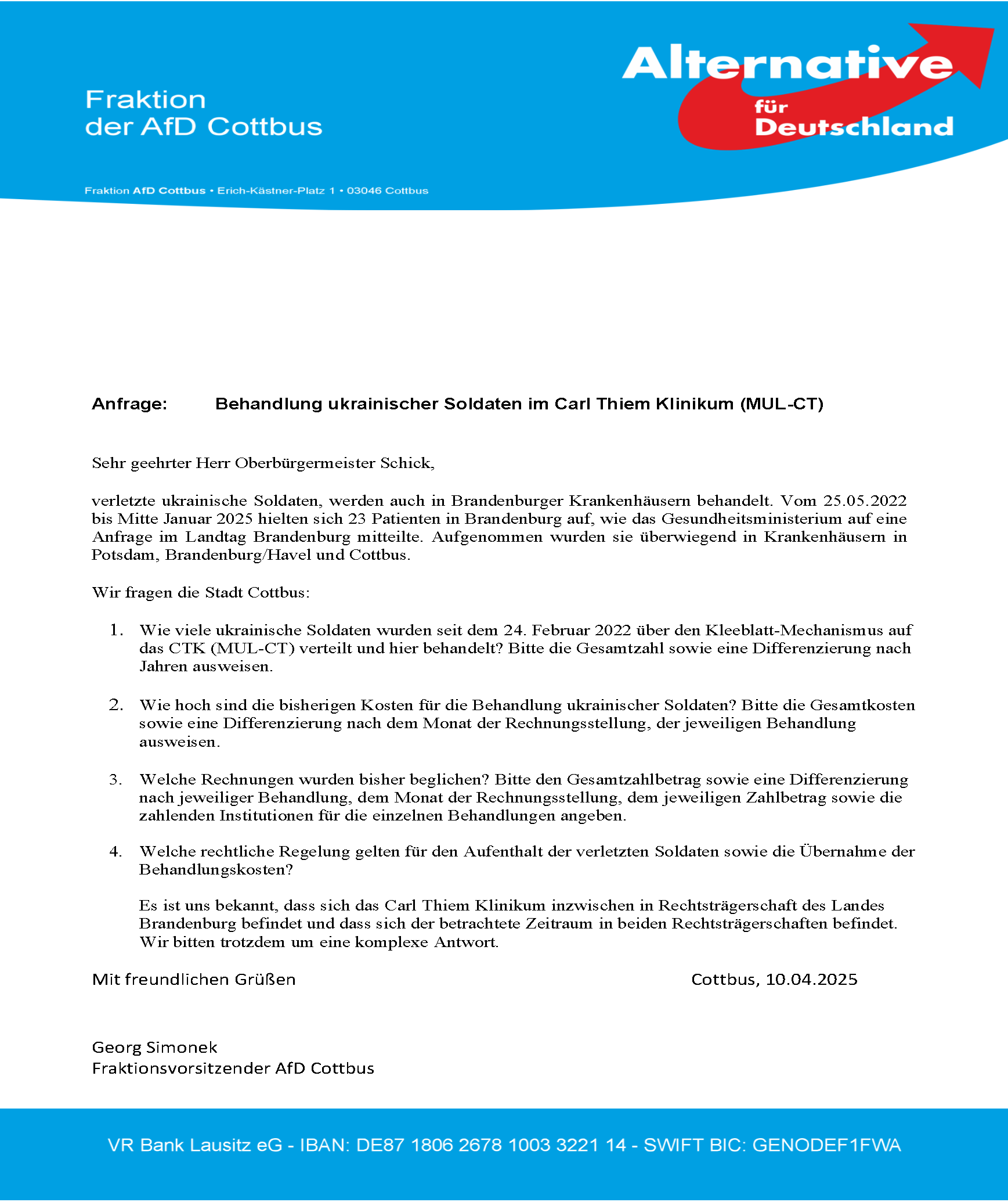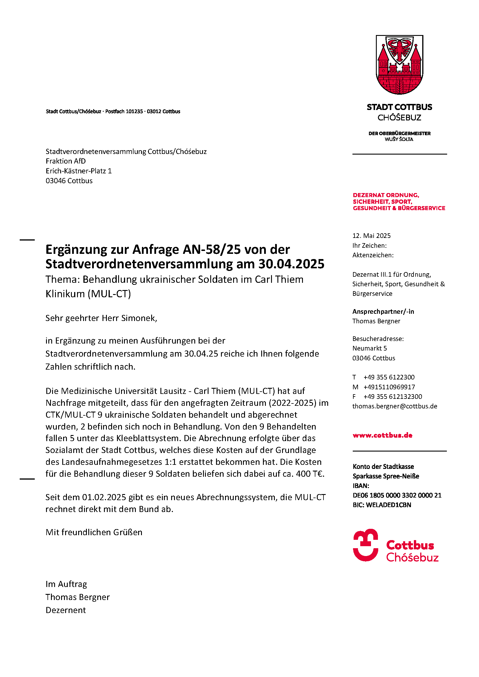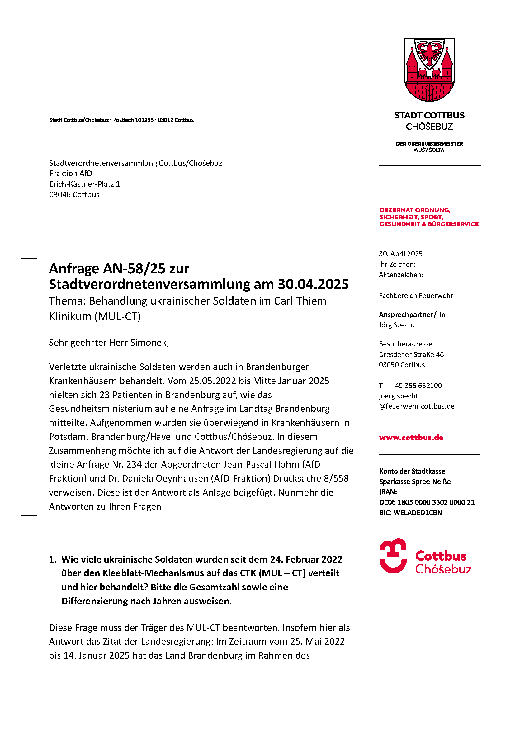 Anfrage AN-58/25 – Behandlung ukrainischer Soldaten im Carl Thiem Klinikum (MUL-CT) Download: AN_58_25 Download: Antwort_AN_58_25 Download: Antwort_AN_58_25_Ergaenzung_vom_14_05_25_